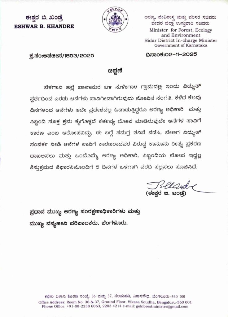 ಕಳೆದ ಕೆಲವು ದಿನಗಳಿಂದ ಆನೆಗಳು ಇದೇ ಪ್ರದೇಶದಲ್ಲಿ ಓಡಾಡುತ್ತಿದ್ದವು ಆದ್ರು ಅರಣ್ಯ ಅಧಿಕಾರಿಗಳು, ಸಿಬ್ಬಂದಿ ಸೂಕ್ತ ಕ್ರಮಕೈಗೊಳ್ಳದೇ ಕರ್ತವ್ಯ ಲೋಪದ ಆರೋಪವಿದೆ ಕರ್ತವ್ಯ ಲೋಪವೇ ಆನೆಗಳ ಸಾವಿಗೆ ಕಾರಣವೆಂಬ ಆರೋಪವಿದೆ ಈ ಬಗ್ಗೆ ಸಮಗ್ರ ತನಿಖೆ ನಡೆಸಲು ಆದೇಶಿಸಿದ ಸಚಿವ ಖಂಡ್ರೆ ಬೇಲಿಗೆ ವಿದ್ಯುತ್ ಸಂಪರ್ಕ ನೀಡಿ ಆನೆಗಳ ಸಾವಿಗೆ ಕಾರಣವಾದವರ ವಿರುದ್ಧ ಕೇಸ್ ದಾಖಲಿಸಲು ಸೂಚನೆ ಅರಣ್ಯ ಅಧಿಕಾರಿ, ಸಿಬ್ಬಂದಿ ಲೋಪ ಇದ್ದಲ್ಲಿ ಶಿಸ್ತುಕ್ರಮದ ಶಿಫಾರಸಿನೊಂದಿಗೆ ವರದಿಗೆ ಸೂಚನೆ 5 ದಿನಗಳಲ್ಲಿ ತನಿಖೆ ನಡೆಸಿ ವರದಿ ನೀಡಲು ಸಚಿವ ಈಶ್ವರ ಖಂಡ್ರೆ ಆದೇಶ