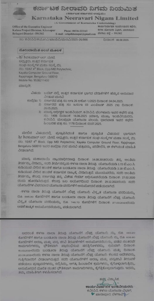 ಉತ್ತರ ಕರ್ನಾಟಕ ಭಾಗದ ಪ್ರಮುಖ ಯೋಜನೆಯಾದ ಕಳಸಾ ಬಂಡೂರಿ ನಾಲಾ ಯೋಜನೆಗೆ ಬಜೆಟ್ ನಲ್ಲಿ ಹೆಚ್ಚಿನ ಅನುದಾನ ಮೀಸಲಿಡಬೇಕು ಹಾಗೂ ಯೋಜನೆಯನ್ನು ತ್ವರಿತವಾಗಿ ಆರಂಭಿಸಬೇಕು ಎಂದು ಮುಖ್ಯಮಂತ್ರಿ ಸಿದ್ದರಾಮಯ್ಯ ಅವರಿಗೆ ಉತ್ತರ ಕರ್ನಾಟಕ ಸಂಘ ಸಂಸ್ಥೆಗಳ ಮಹಾ ಸಂಸ್ಥೆ ವತಿಯಿಂದ ಮನವಿ ಮಾಡಲಾಗಿತ್ತು. ನಮ್ಮ‌ ಮನವಿಗೆ ಸ್ಪಂದಿಸಿರುವ ಸರ್ಕಾರ ಮಹದಾಯಿ ಯೋಜನೆಗೆ ರಾಜ್ಯ ಸರ್ಕಾರ ಕೈಗೊಂಡಿರುವ ಕ್ರಮಗಳು ಹಾಗೂ ಯೋಜನೆ ಅದಕ್ಕಾಗಿ ಮೀಸಲಿಟ್ಟಿರುವ ಹಣ ಮತ್ತು ಯೋಜನೆ ಪ್ರಾರಂಭಿಸಲು ಇರುವ ಕಾನೂನಾತ್ಮಕ ಸಮಸ್ಯೆಗಳ ಪರಿಹಾರದ ಕುರಿತು ಅಧಿಕೃತ ಮಾಹಿತಿ ನೀಡಿದ್ದು.. ಶೀಘ್ರವೇ ಯೋಜನೆ ಆರಂಭಿಸುವ ಭರವಸೆ ನೀಡಿದೆ.‌..