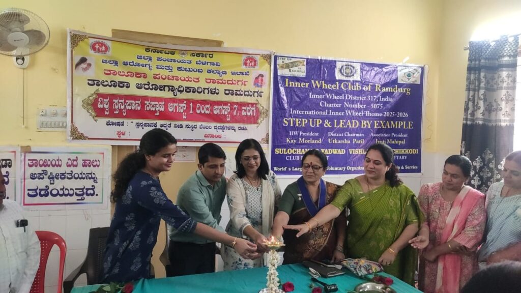 ರಾಮದುರ್ಗ- ಜಿಲ್ಲಾ ಪಂಚಾಯತಿ ಬೆಳಗಾವಿ ಆರೋಗ್ಯ ಮತ್ತು ಕುಟುಂಬ ಕಲ್ಯಾಣ ಇಲಾಖೆ ತಾಲೂಕ ಪಂಚಾಯಿತಿ ರಾಮದುರ್ಗ ತಾಲೂಕ ವೈದ್ಯಾಧಿಕಾರಿಗಳು ರಾಮದುರ್ಗ ಹಾಗೂ ಇನ್ನರ್ ವೀಲ್ ಕ್ಲಬ್ ರಾಮದುರ್ಗ್ ಇವರ ಸಂಯುಕ್ತ ಆಶ್ರಯದಲ್ಲಿ ವಿಶ್ವ ಸ್ತನಪಾನ ಸಪ್ತಾಹಕ್ಕೆ ಚಾಲನೆ ನೀಡಲಾಯಿತು ಕಾರ್ಯಕ್ರಮವನ್ನು ಜ್ಯೋತಿ ಬೆಳಗಿಸುವ ಮೂಲಕ ತಾಲೂಕ ವೈದ್ಯಧಿಕಾರಿ ಡಾ. ನವೀನ್ ಕುಮಾರ್ ನಿಜಗುಲಿ ಹಾಗೂ ಇನ್ನರ್ ವೀಲ್ ಕ್ಲಬ್ ಅಧ್ಯಕ್ಷ ಶ್ರೀಮತಿ ಸುಲೋಚನಾ ಬಸವರಾಜ್ ಯಾದವಾಡ ಉದ್ಘಾಟಿಸಿದರು ಕಾರ್ಯಕ್ರಮದಲ್ಲಿ ತಾಯಿಯ ಎದೆ ಹಾಲಿನ ಮಹತ್ವದ ಕುರಿತು ಮಹಿಳೆಯರಿಗೆ ಬಾಣಂತಿಯರಿಗೆ ಅರಿವು ಮೂಡಿಸಲಾಯಿತು. ಕಾರ್ಯದರ್ಶಿಗಳಾ ವಿಶಾಲಾಕ್ಷಿ ಚಿಕ್ಕೋಡಿ,ಮಾಜಿ ಅಧ್ಯಕ್ಷರಾದ ನಿರ್ಮಲಾ ಹಂಜಿ ವೈದ್ಯೆ ಸೌಮ್ಯ ಮೆಳ್ಳಿಕೇರಿ, ಪದಾಧಿಕಾರಿ ಲೀಲಾವತಿ ಆರಿಬೆಂಚಿ, ಉಮಾ ನೇಮಗೌಡರ ಕಮಲಾ ಕುಂಬಾರ ಹೇಮಲತಾ ಕಲ್ಯಾಣಿ ,ಸೇರಿದಂತೆ ಸರ್ವ ಸದಸ್ಯರು ಉಪಸ್ಥಿತರಿದ್ದರು